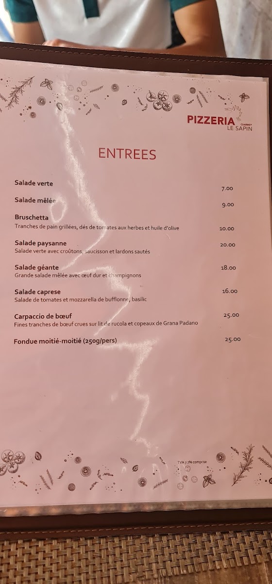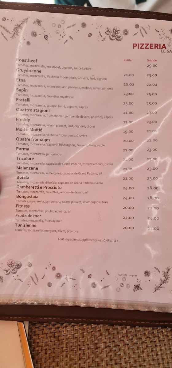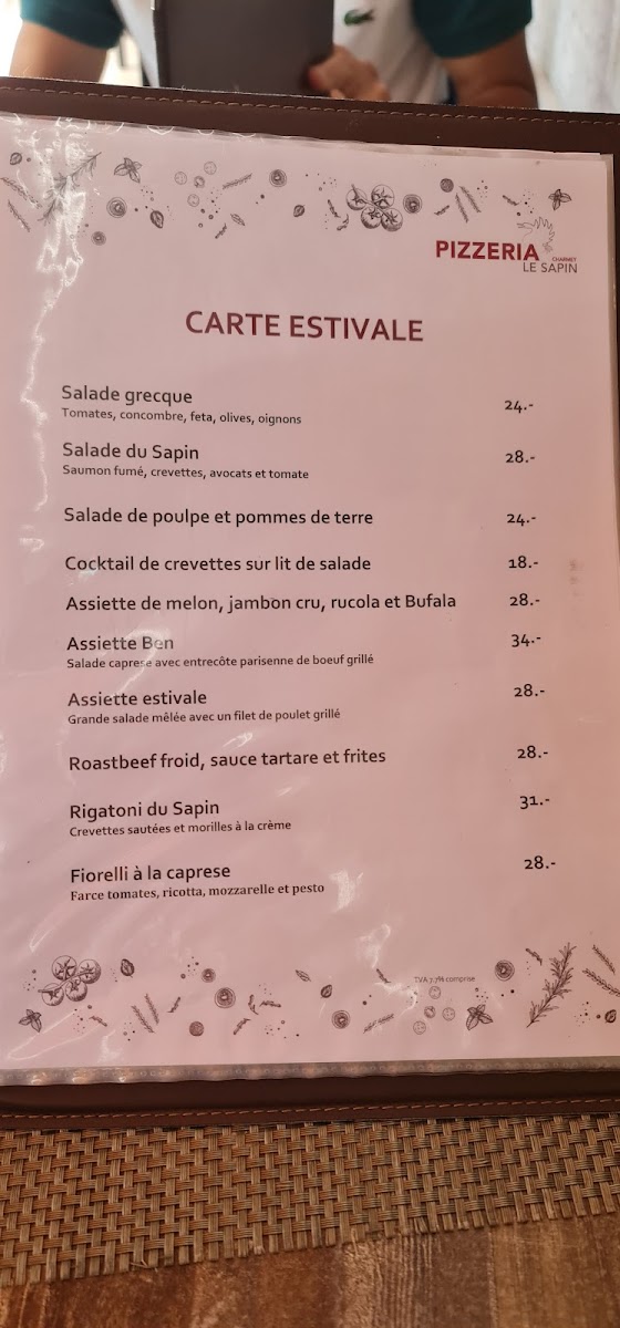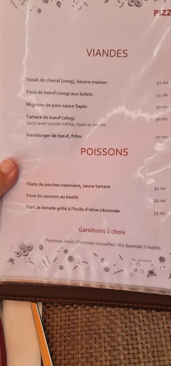 The menu at Pizzeria Le Sapin in Charmey offers a delightful variety of dishes, each designed to cater to different tastes with a blend of traditional and unique flavors. The pizza selection is particularly impressive, with standouts like the Pizza Contadina, a rustic option packed with fresh ingredients, and the Pizza Hawaï, a classic with a tropical twist. For those seeking something with a bit more heat, the Pizza Tunisienne brings a spicy flair to the table. The restaurant also excels in pasta, with dishes like the rich and flavorful Steinpilz Gnocchi, which combines tender gnocchi with savory wild mushrooms. To round off a satisfying meal, the Café Gourmand provides a delightful assortment of small desserts, perfect for those with a sweet tooth. Whether you're in the mood for pizza, pasta, or dessert, Pizzeria Le Sapin’s menu offers a well-rounded selection that promises to satisfy any craving.